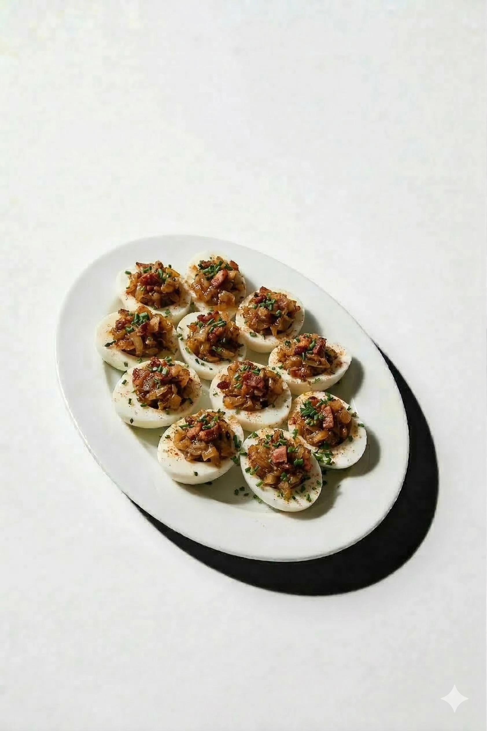 Gotowane jajko faszerowane pastą z cebuli i boczku.