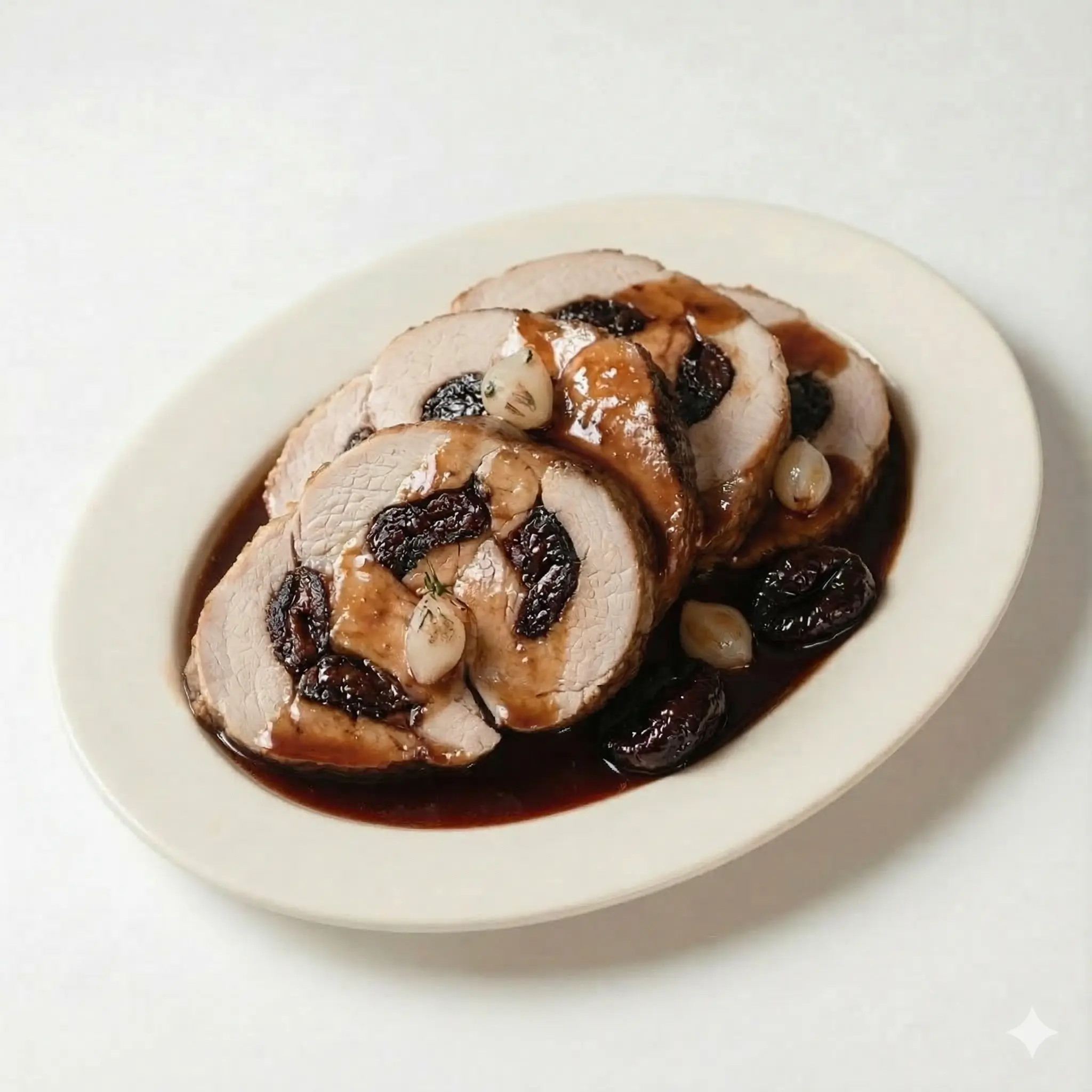 Schab wolno gotowany z dodatkiem suszonej śliwki. Soczysty i lekko słodkawy.